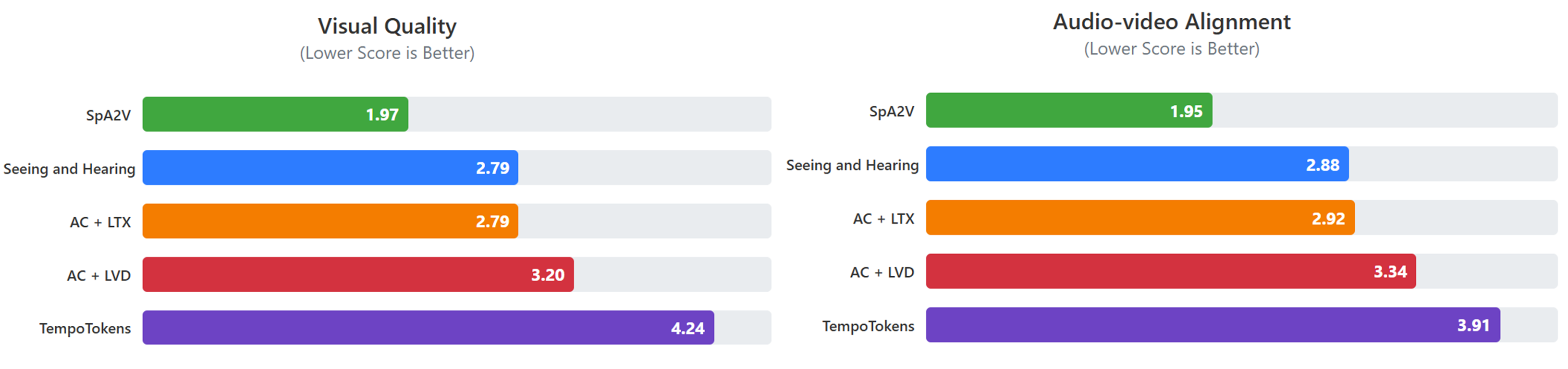 Ranking scores in user study highlight the subjective preference of users for the videos generated by SpA2V over the other baselines in Visual Quality and Audio-Video Alignment.